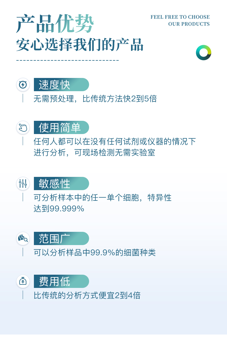 5、 灵敏度高达可检测到1目标微生物;特异性高达99.999%;