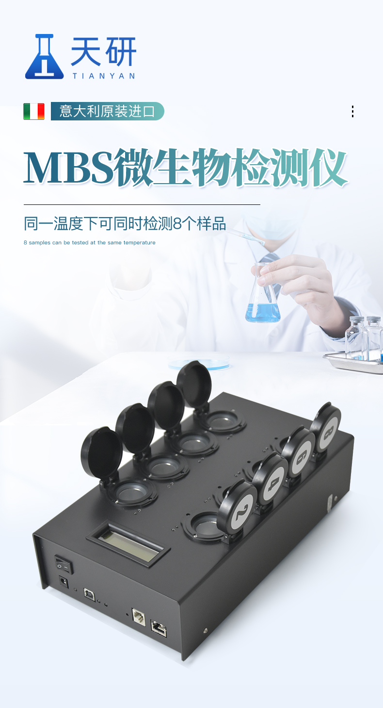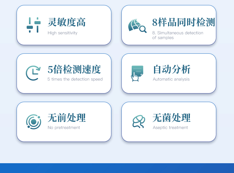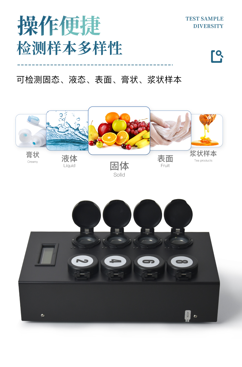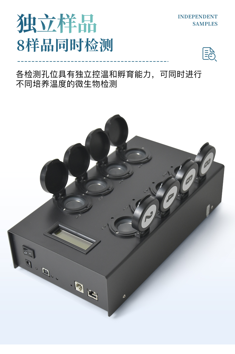 4、 检测样本只需1ml/1g;同一温度下可同时检测8个样品;