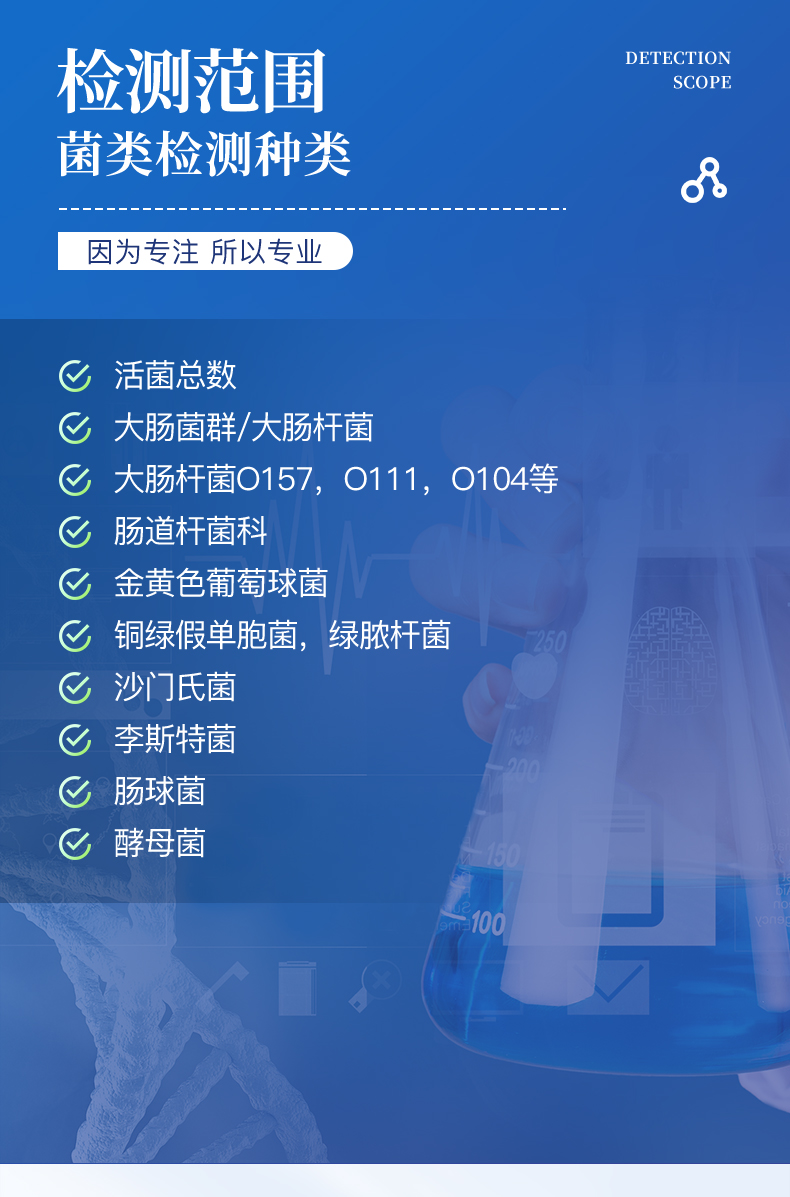 | 活细菌总数 :大肠菌群/粪大肠菌群/大肠杆菌/大肠杆菌O157, O111, O104...等 | 肠道杆菌科 :金黄色葡萄球菌 铜绿假单胞菌;绿脓杆菌 沙门氏菌 李斯特菌 肠球菌 酵母菌 |