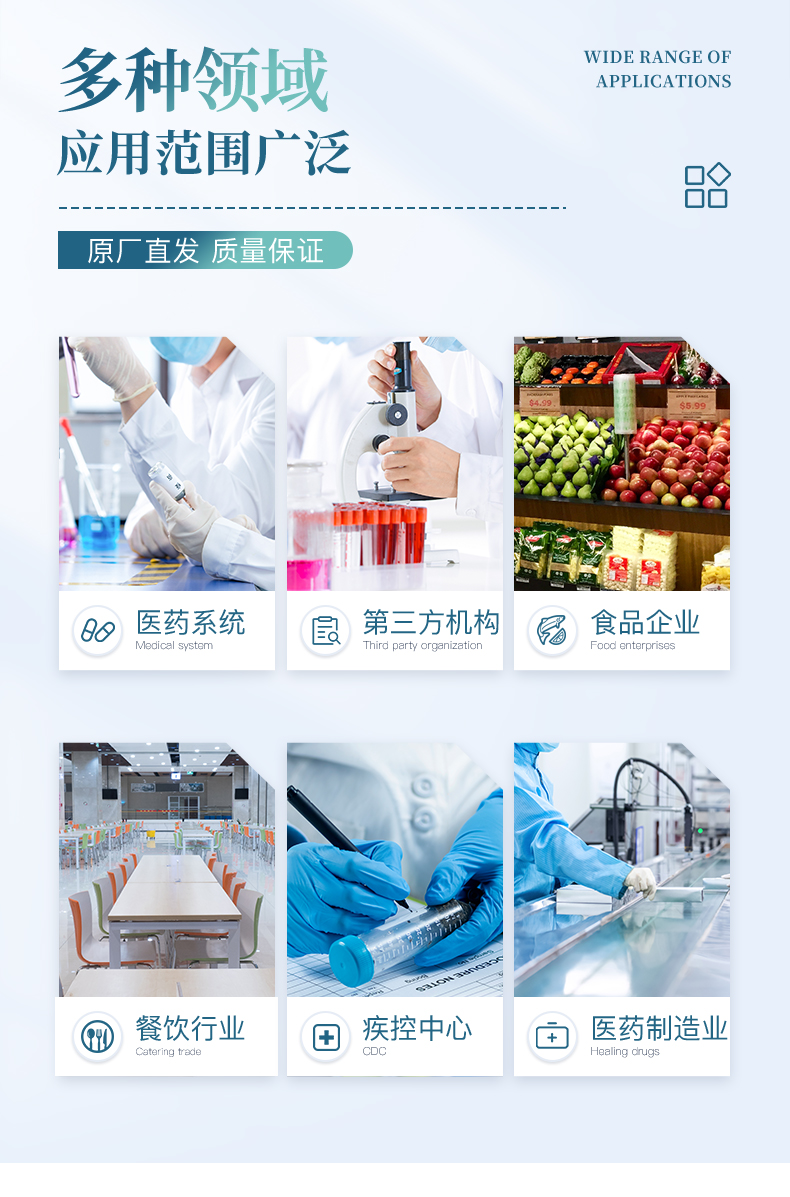 | 卫生控制: -食品(HACCP) -厨房、工具、表面(HACCP) -水质 -(CDC)疾病控制、进出口检验检疫 -药品及 化妆品 | 与我们的生活息息相关,例如: 咖啡馆、餐厅 ,水源检测、制水厂 ,分析实验室和HACCP诊断 ,农产品及相关加工公司 ,药厂、药房、化妆品厂 ,环境监测机构 ,水配送公司 ,消费者保护团体、工商管理机构 ,室内空调调节公司 | 集传统检验方法优点于一身:培养皿法、 酶法(β-葡萄糖苷酸酶分析)、 -免疫法(抗原搜寻)、基因法(基因搜寻) | 检验样本无需任何前处理 :-液态样本,固态样本和表面样本均无需前处理 ; | 定性和定量分析 :-搭配检测机:100%的定量分析 、肉眼判读:定性或半定量分析 ; | 简单便捷 :简单的三个步骤得到检测结果 ; | 检验迅速 :是传统检验方法速度的2~5倍 ; | 高灵敏性:可以检测到1目标微生物(理论极值); | 高特异性 :特异性高达99.999%(理论极值) ; | 检测瓶就是实验室 :微生物检测瓶随时可用、未受过严格专业训练的检测人员也可随时随地进行检测 ; | 使用后安全丢弃 :和过期药物同样处理 ; |