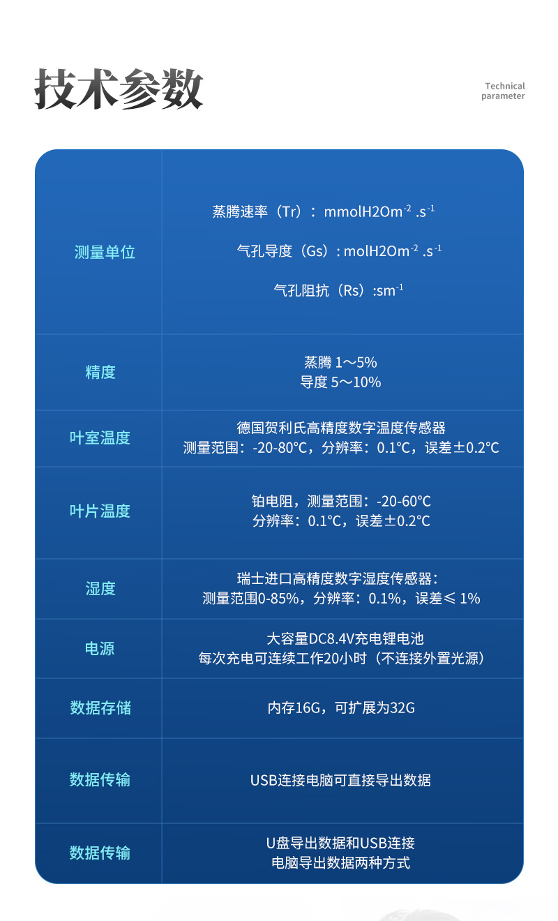 | 空气温度:瑞士进口高精度数字温度传感器,测量范围:0-50℃,分辨率:0.1℃,误差±0.2℃ | 叶片温度:铂电阻,测量范围:0-50℃,分辨率:0.1℃,误差±0.2℃ |
