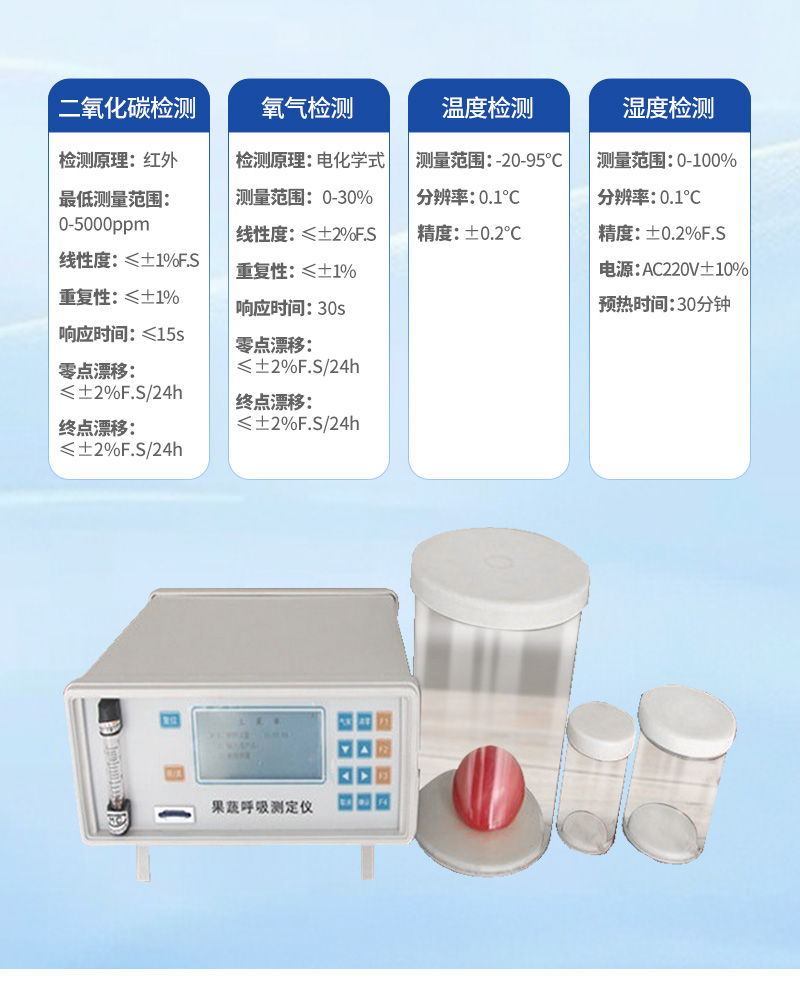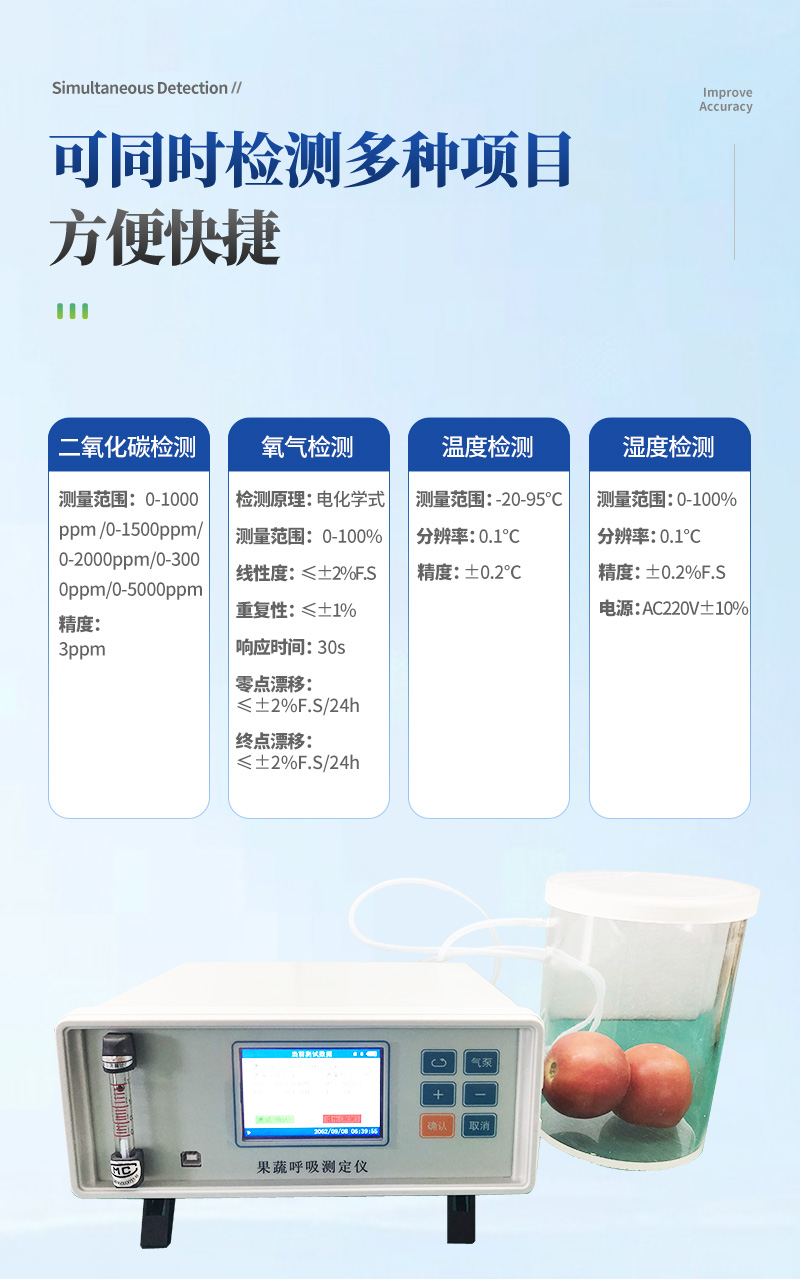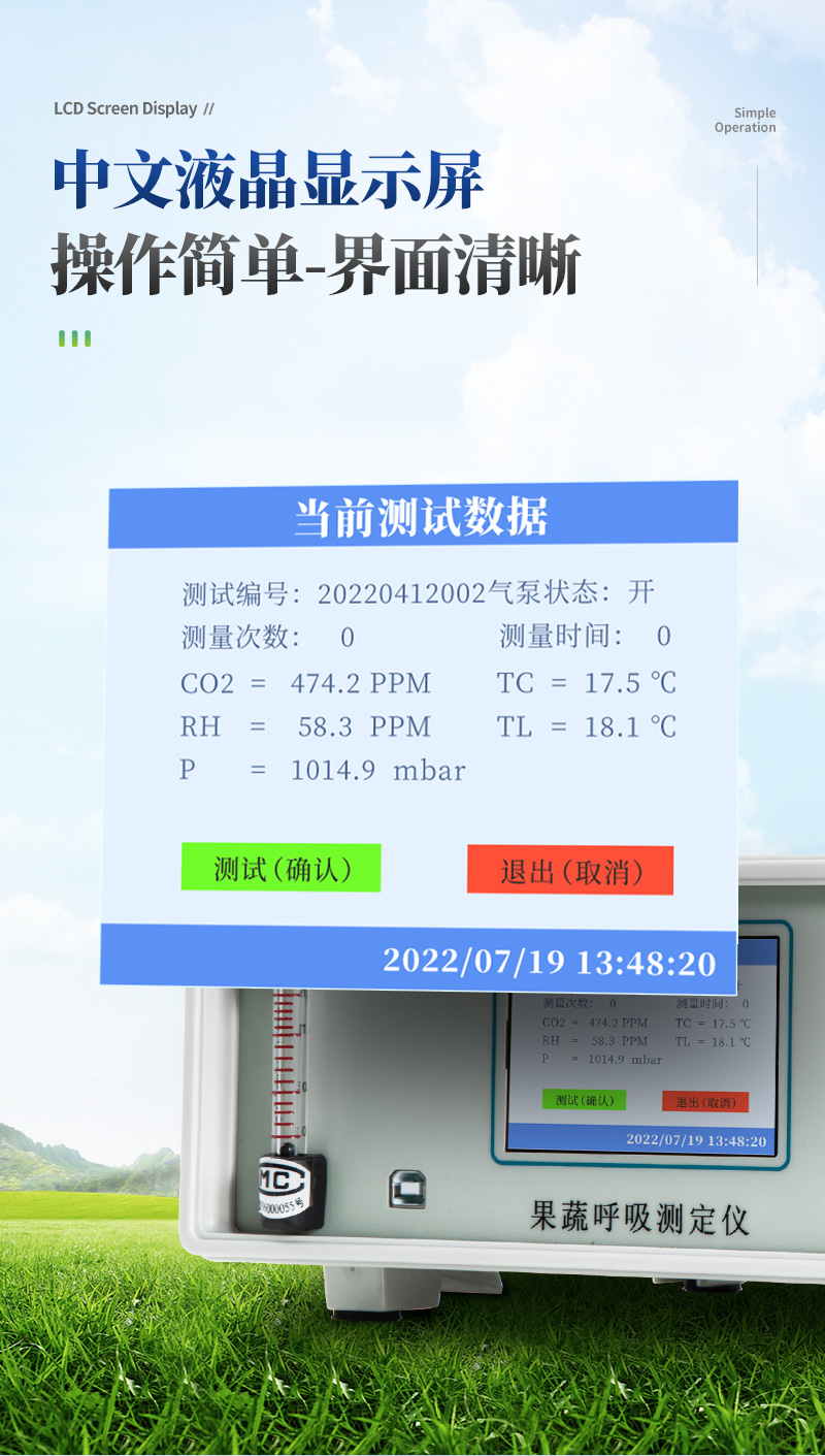 果蔬呼吸测定仪专门用于常温、冷藏库、气调库、超市冷柜等储藏条件下的果品和蔬菜呼吸强度的测定和分析研究。该仪器的特点是可以根据果蔬的大小来选择不同体积的呼吸室,加快了平衡和测定时间;可以同时显示呼吸室的CO2浓度、O2浓度、温度和湿度。该仪器具有多功能、高精度、快速、**、方便等特点,非常适合于食品,园艺、果品、蔬菜、外贸等各类学校、科研院所用于各类果品和蔬菜的呼吸测定。