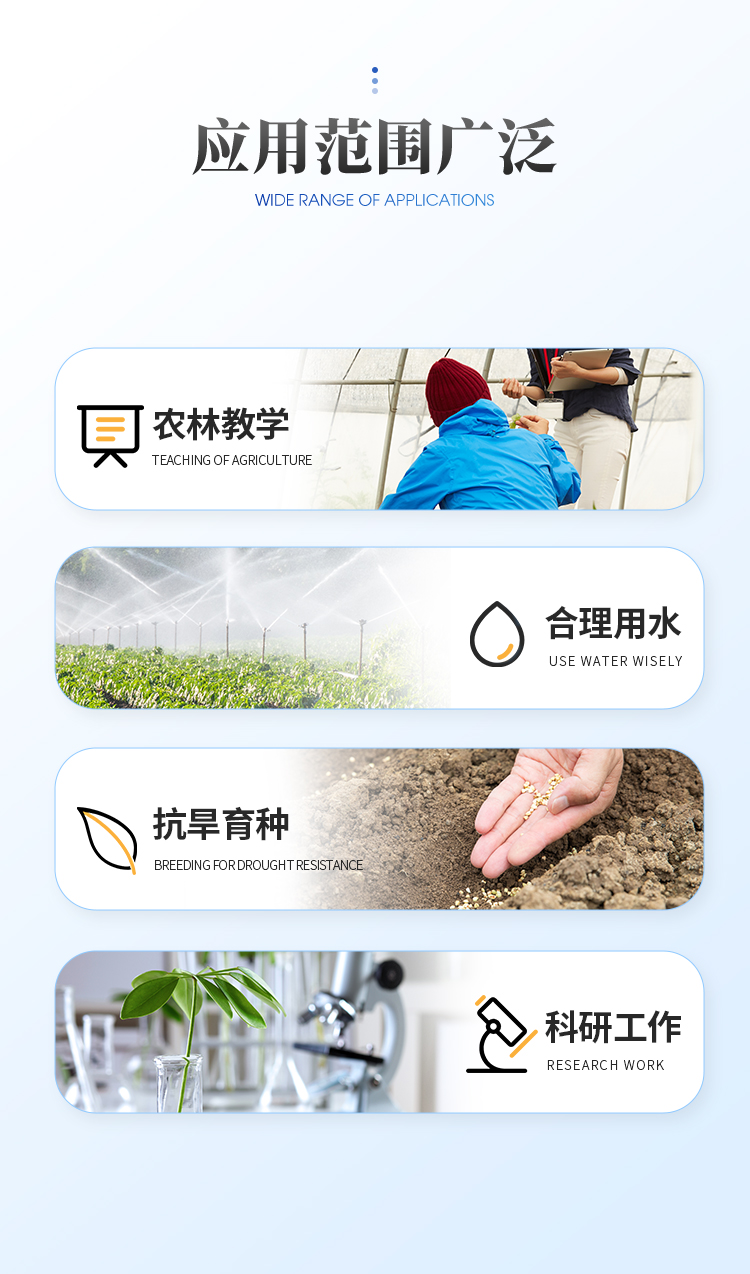 产品描述:植物水势测定仪是用于测定植物水分状况和它的组成成分及压去木质部位导管汁液提供成分分析用的一种分析仪器。可以利用此仪器研究植物的水分关系和植物与环境的关系。该仪器适用于植物生理学、生态学、农学、林学及牧草等的研究,可据此指导作物及林草的合理用水和抗旱育种等工作,是从事农【详情】