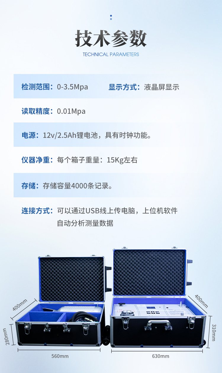 | 读取精度:0.01Mpa | 电源:12v/2.5Ah锂电池,具有时钟功能 |